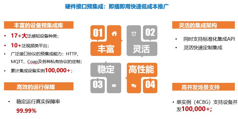 迄今南宫NG·28公司已经预集成17+大泛感知设备种类,10+泛视频类平台,广泛接口协议的预集成能力涵盖了HTTP、MQTT、Coap及各种私有协议的定制,累计集成设备实例达100,000+。它还支持标准化集成API,可灵活快速地定制集成,通过构建规则引擎,实现了各设备间的联动应用,比如检测到违规停车,联动广播就会自动播报提醒,为社区管理服务赋能。
