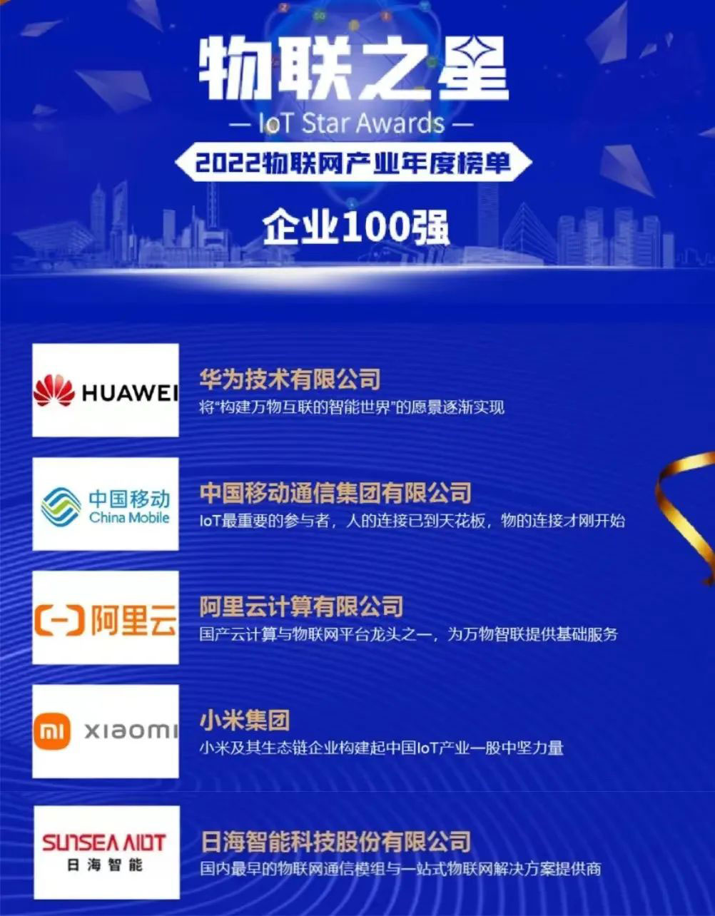 该年度榜单以公司业绩规模与人员规模较大且稳定、近三年业绩规模与净增长率表现良好、研发投入金额与占比较大并有行业影响力的新品发布、同时在物联网领域行业地位突出为四个评选标准进行严格、客观评选。飞速发展的物联网行业群雄并起,优秀企业不断涌现,南宫NG·28公司智能脱颖而出,与华为、中国移动、阿里云计算等知名企业齐头并进、共同成为中国物联网企业百强,背后是近三十年的实力积淀。